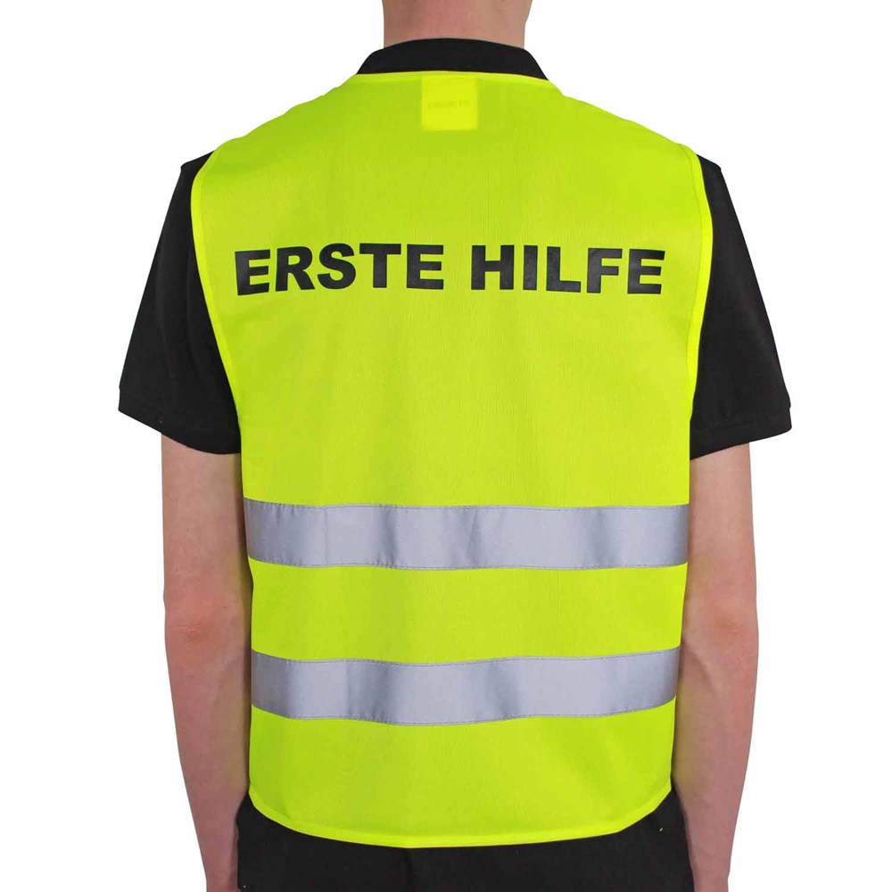 Unsere Warnweste Premium gelb ist aus 100% Polyester, wird nach EN ISO 20471 produziert und ist TÜV-Rheinland geprüft. Mit Anleitung einzeln im wiederverschließbaren Polybeutel verpackt. Durch die beiden Klettverschlüsse ist die Größe variabel einstellbar. Mit zwei reflektierenden Streifen, perfekt vernähte Qualität und Einleger in sieben Sprachen mit den gesetzlichen Pflichtangaben. Mit dem Standardmotiv 'Erste Hilfe' auf der Rückseite 1farbig schwarz bedruckt. Ein zusätzlicher Druck auf der Vorderseite ist möglich. Gern erstellen wir Ihnen dazu ein Angebot.