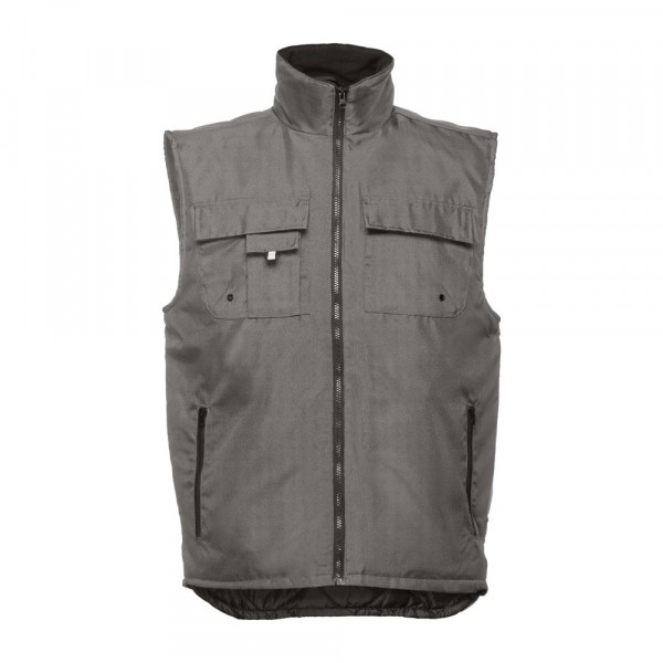 Herren Arbeitsweste aus 100% Polyester mit Acrylbeschichtung (170g/m²), gepolstert und gefuttert. Innenseite aus 100% Polyester-Taft (65g/m²) mit Polar Fleece Kragen. Die Weste hat 6 Taschen, 5 Taschen auf der Vorderseite davon 2 Taschen mit Reißverschluss, 1 Tasche für das Handy und 1 Innentasche. Elastisches Band an den Seiten. Der Reißverschlusszugang auf der Rückseite vereinfacht die Veredelung. Größen: S, M, L, XL, XXL, 3XL