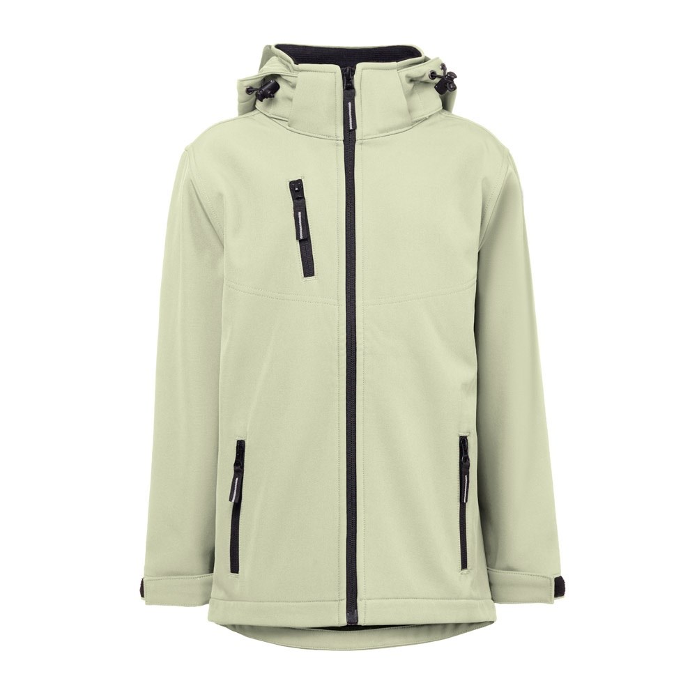Sofschelljacke für Kinder aus 96% recyceltem Polyester-Softshell und 4% Elastan (280 g/m²), mit zwei Schnürsenkeln und wasserabweisendem Futter. Mit Fleece gefütterte Jacke (100% recyceltes Polyester) mit 2 Fronttaschen und einer schrägen Brusttasche, beide mit Reißverschluss. Abnehmbare und verstellbare Kapuze mit Kordelzug und selbstklebendem Reißverschlussband zur Anpassung an den Kragen. Vordere Öffnung mit YKK®-Reißverschluss - eine Marke, die moderne Ausrüstung und hohe Qualitätskontrolle einsetzt. Verstellbare Manschetten mit selbstklebendem Verschlussband. Abgerundeter unterer Rücken. Größen: 4, 6, 8, 10, 12