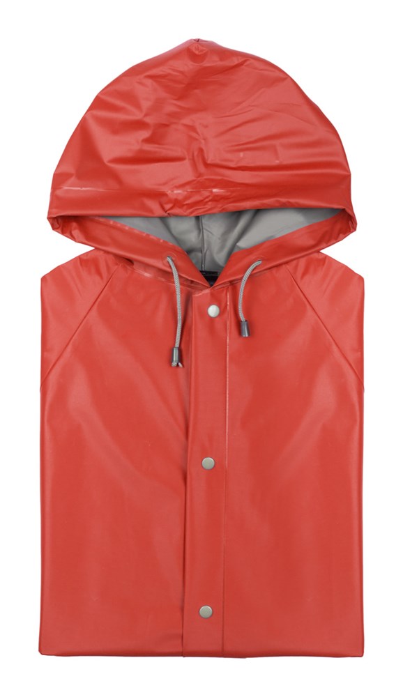 Regenjacke mit Kapuze aus widerstandsfähigem PVC mit versiegelter Oberflächenbeschichtung, Druckknopfverschluss und 2 Außentaschen.