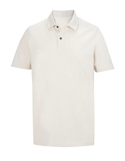 100% gekämmte ringgesponnene Baumwolle | Piqué | Unisex | Kurze Ärmel mit einem einzigen Saum | Ripp-Kragen mit Nackenband | Zickzack-Naht und Kontraststreifen am Kragen und innen am Halsausschnitt | Knopfleiste mit zwei schwarzen Knöpfen | Überschnittene Ärmel und bequeme Passform