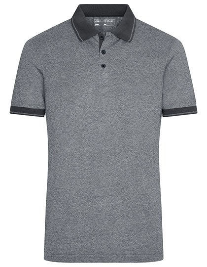 Melange-Polo mit modischen Details | Feiner Single Jersey | Lässige Schnittform | Gestrickter Polokragen und Armbündchen mit Kontraststreifen | Drei Knöpfe