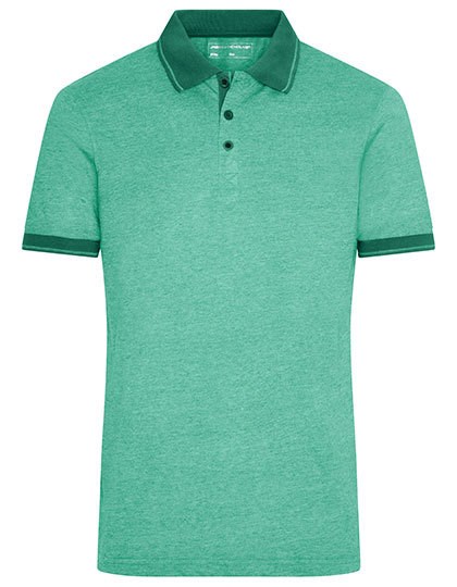 Melange-Polo mit modischen Details | Feiner Single Jersey | Lässige Schnittform | Gestrickter Polokragen und Armbündchen mit Kontraststreifen | Drei Knöpfe