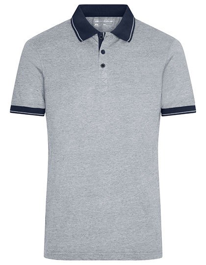 Melange-Polo mit modischen Details | Feiner Single Jersey | Lässige Schnittform | Gestrickter Polokragen und Armbündchen mit Kontraststreifen | Drei Knöpfe