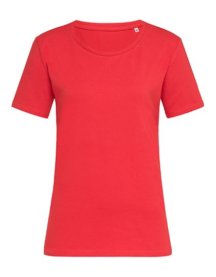 Bequem geschnittenes Damen-T-Shirt aus angenehm weichem Baumwoll-Elasthan-Gemisch | Single-Jersey „Full-Feeder“ | Normal Fit | Verstärkte Schulternaht | Schmaler Kragen aus T-Shirt-Stoff | Schmaler Ärmelsaum | Necktape | Seitennähte | Kleines Größenetikett im Nacken | Pflegeetikett in der Seitennaht
