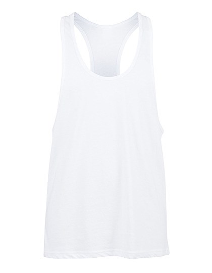 Single Jersey | Racerback | Lang geschnitten | Abgesetzte Einfassung des Halsausschnitts und der Armlöcher | Gerader Saum mit Doppelnaht | Abreißetikett