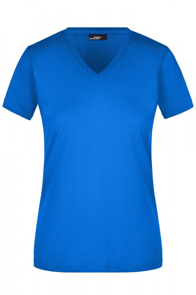 Einlaufvorbehandelter Single Jersey Gekämmte, ringgesponnene Baumwolle Körpernaher Schnitt mit Seitennähten V-Ausschnitt mit 1:1 Bündchen eingefasst JN972: Taillierter Schnitt 1/2 Oberweite: 42 cm 1/2 Taillenweite: 38 cm 1/2 Saumweite: 45 cm Länge ab Schulter: 62 cm OEKO-TEX® Standard 100 (15.0.70467) Baumwolle Slim Fit V-Ausschnitt
