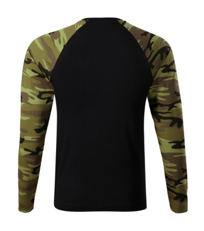 Schnitt mit Seitennähten, schmal geformter Kragensaum aus 1:1 Rippstrick mit 5 % Elastanzugabe, Innenseite des Kragens durch ein gewebtes Band in der Farbe 01 versäubert, lange Raglanärmel in Camouflage-Farbe
