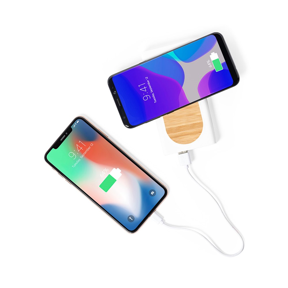 Linie "Natur", externer Zusatzakku mit integriertem drahtlosen Ladegerät und 15-W-Schnellladefunktion. Gehäuse aus einer Kombination von Bambus und PLA (Polymilchsäure), die aus 100% natürlichen Ressourcen wie Maisstärke, Yucca oder Zuckerrohr gewonnen wird und am Ende ihrer Lebensdauer zu 100% kompostierbar ist. 8.000 mAh Kapazität, mit Ladestatusanzeige. Dualer Typ-C-Eingangs-/Ausgangsanschluss, Micro-USB-Eingang und 1 USB-Ausgang. Micro-USB-Ladekabel im Lieferumfang enthalten und kompatibel mit Geräten, die mit kabelloser Ladetechnik ausgestattet sind. Große Branding-Fläche und präsentiert in einer attraktiven Öko-Design-Box. Mit PLA-Emblem auf dem Artikel.Alle unsere externen Zusatzbatterien haben eine reale Kapazität und bestehen aus nicht recycelten Batterien der Klasse A mit einer Lebensdauer von mindestens 500 Ladezyklen, die den CE-Vorschriften entsprechen. Darüber hinaus werden sie gemäß den RoHS-Normen und unter Einhaltung der folgenden Sicherheitsanforderungen hergestellt: Überladungsschutzsystem der Powerbank. Vollständiges Entladeschutzsystem, das die Haltbarkeit der Powerbank erhöht. Blockiersystem zur Vermeidung von Kurzschlüssen. Konstantes Ladetransfersystem, entsprechend der Kapazität des Zielgeräts".