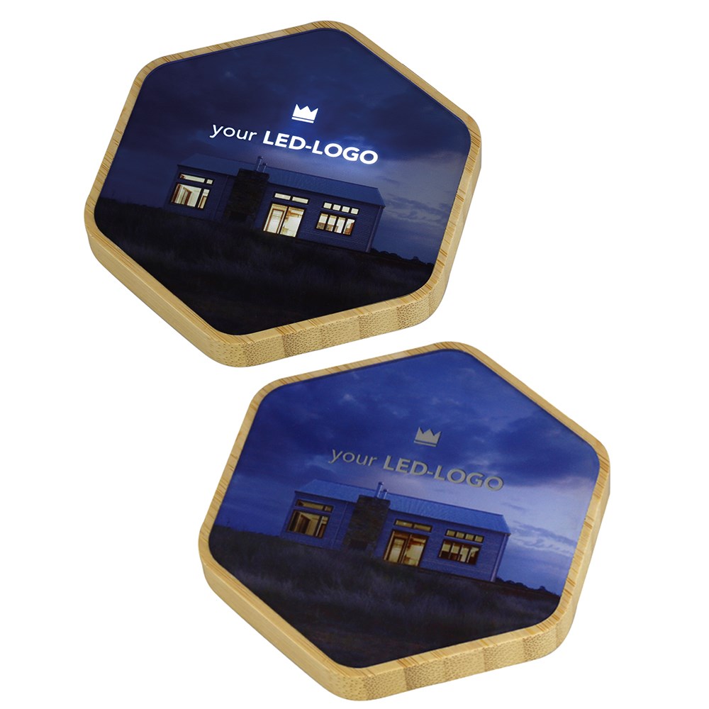 Formschöner Wireless Charger mit Bambusgehäuse und 15 Watt Output für bequemes, induktives Laden Ihrer Geräte. Das besondere Highlight Ihr fotorealistisch gedrucktes Werbemotiv auf dem Hochglanz Inlay. Ist der Charger angeschlossen, werden die hellen Bereiche Ihres Motives effektvoll beleuchtet. Mit Typ C Anschluss und USB A auf C Kabel. Einzeln verpackt in nachhaltiger Box aus ungebleichtem, braunen Kraftkarton. Vierfarbiges, Fotorealistisches Leuchtmotiv inklusive.