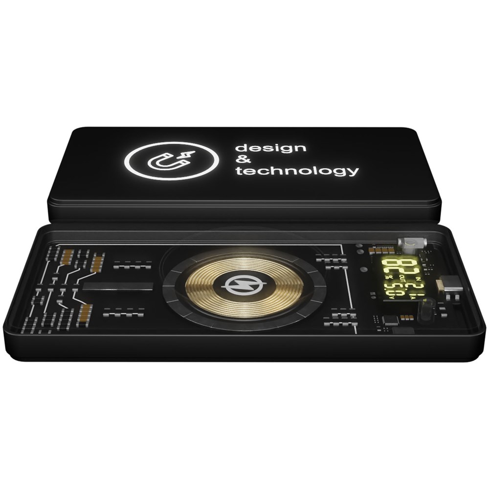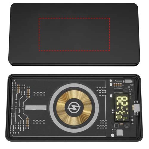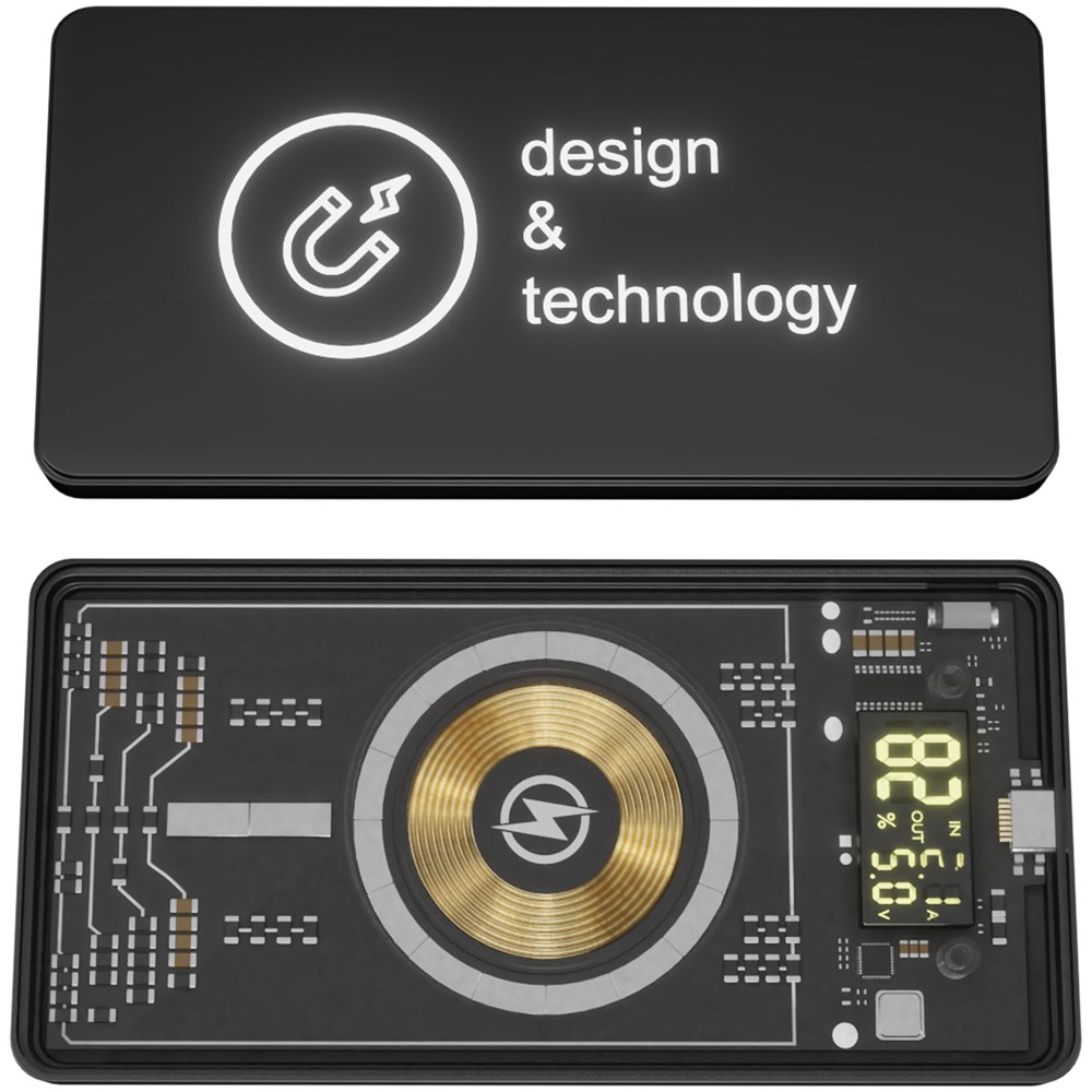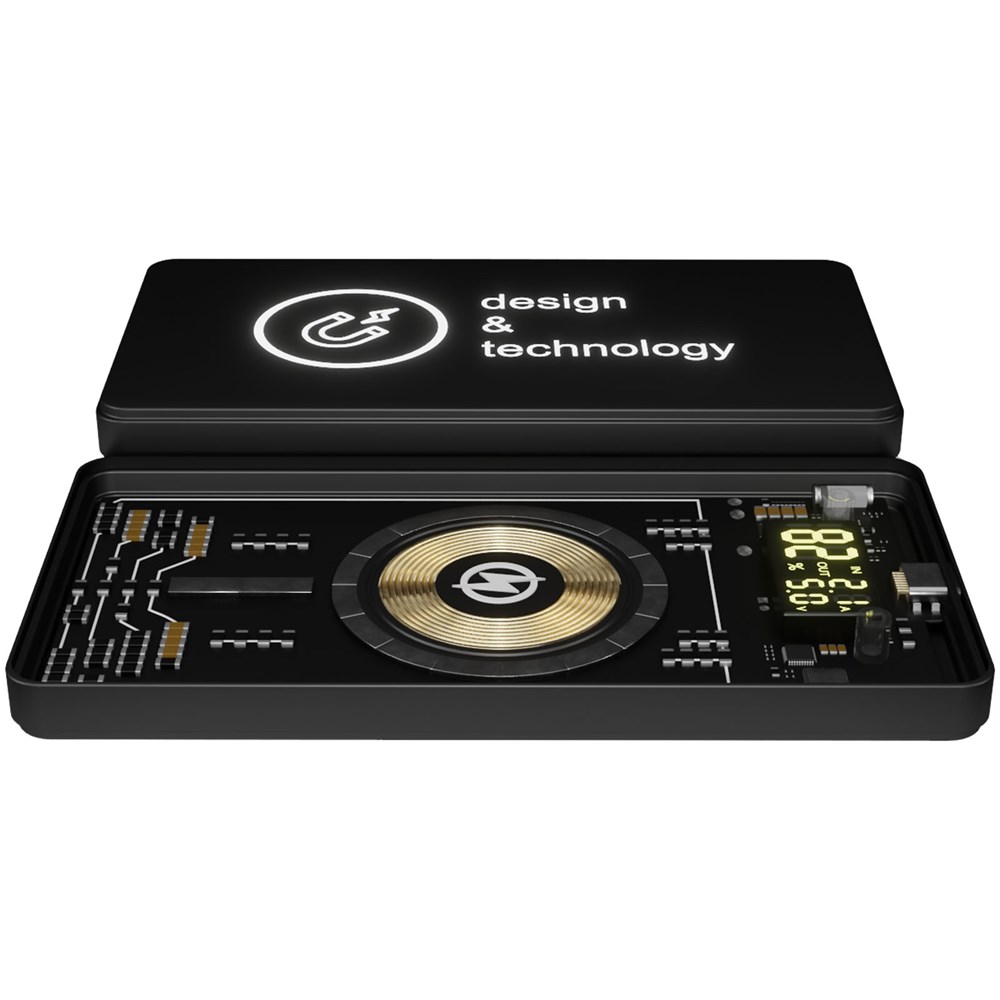 Magnetische kabellose 5000 mAh Powerbank (14 x 7 x 1,3 cm) mit kabelloser 5W Ladefunktion, Digitalanzeige und USB Typ C Ausgang/Eingang. Die Technologie dieser Powerbank wird auf der Rückseite durch das transparente Gehäuse sichtbar, das die Leiterplatte zeigt. Die Vorderseite ist mit einer Soft-Touch-Oberfläche aus Gummi und mit einer Lasergravur versehen, auf der das Logo leuchtet. Die Powerbank hat einen doppelten USB 2 A Ausgang und besteht zu mindestens 50 % aus recyceltem ABS-Kunststoff. Wenn das Telefon nicht über die MagSafe Technologie verfügt (ab iPhone 12), kann der magnetische Aufkleber (mitgeliefert) auf der Rückseite des Telefons angebracht werden, um es mit der Magnethalterung kompatibel zu machen. Wird mit einem 3-in-1-Ladekabel (Typ C, Micro USB, iPhone) aus recyceltem PET geliefert. Verpackt in einer Geschenkbox (20,1 x 10 x 2 cm) mit Magnetverschluss. Inklusive 3 Jahre Garantie.