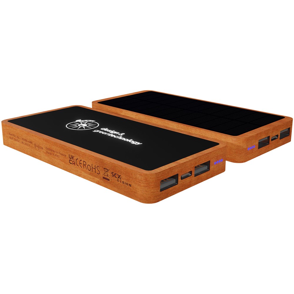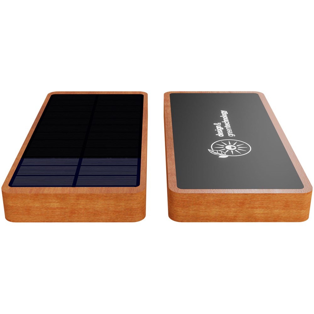 Solar-Powerbank (14,4 × 6,9 × 1,95 cm) aus Holz und weichem, recyceltem Kunststoff. Sie verfügt über eine Kapazität von 10.000 mAh und kann mit einem leuchtenden Logo individuell gestaltet werden. Die Powerbank kann mit ihrem Solarmodul aus monokristallinem Material oder mit dem mitgelieferten 5-in-1-Ladekabel aus rPET wieder aufgeladen werden. Diese Powerbank verfügt über einen USB-C- und einen USB-A-Eingang/Ausgang sowie einen kabellosen 5-W-Ausgang. Ihre Geräte können über das mitgelieferte Kabel oder kabellos (5 W) geladen werden. Das Logo leuchtet 30 Sekunden lang auf, wenn die Powerbank in die Hand genommen wird, und bleibt während des Ladevorgangs beleuchtet. Verpackt in einer Geschenkbox aus recyceltem Papier (20 × 8,8 × 2,8 cm). Inklusive 3 Jahre Garantie.