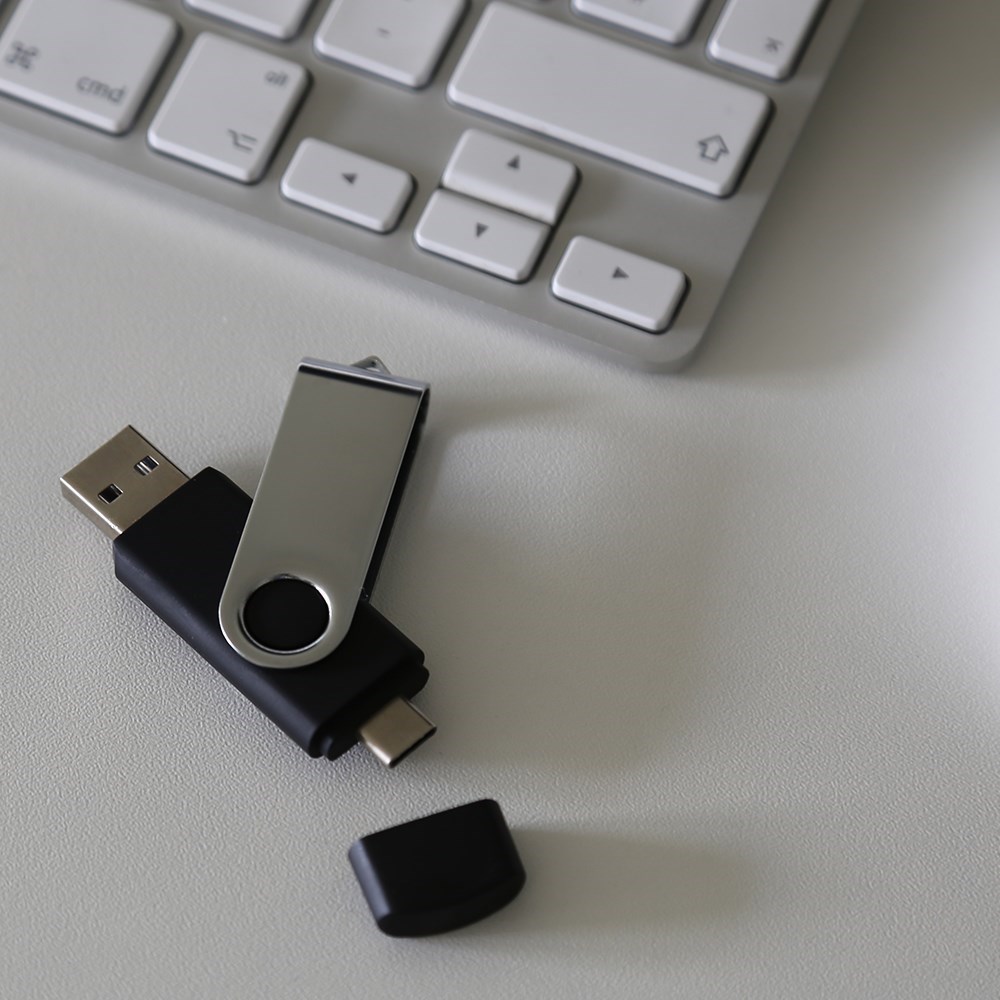 Praktischer on-the-go Speicher-Stick mit USB-A und Type-C Anschluss. Für alle modernen Smartphones, Computer oder Tablets. Der robuste Metall-Drehbügel mit Aufhängungsmöglichkeit für den Schlüsselanhänger ermöglicht ein simples Öffnen bzw. Abdecken. Mit Kapazität nach Wunsch zwischen 8 und 64 GB, in vier verschiedenen Standardfarben und gegen Aufpreis schon ab 100 Stück in Sonderfarbe erhältlich.