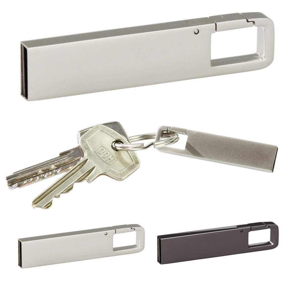 Kleiner USB Stick aus Metall mit einem Karabiner-Haken. Ideal für schnelles Lösen und Befestigen am Schlüsselband. COB-Chiptechnologie. Standardverpackung Teabag.