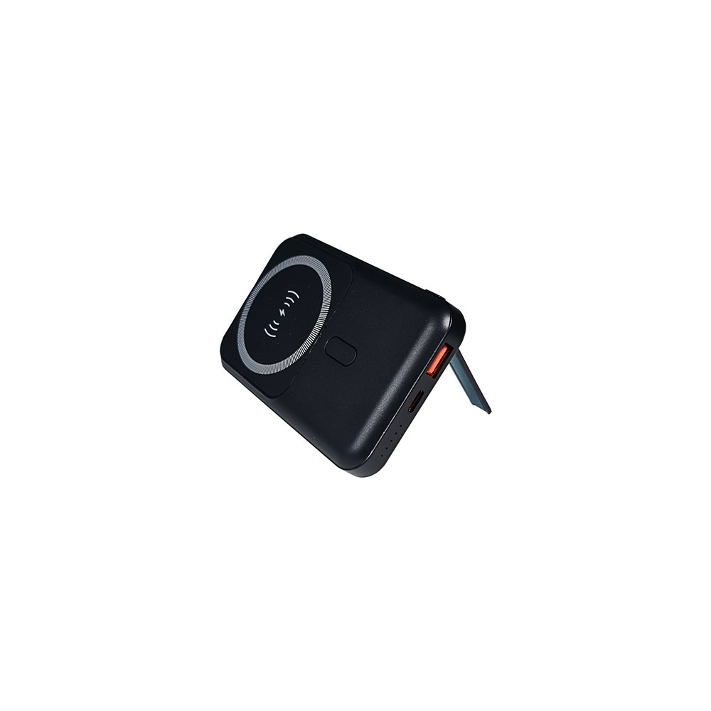 Besondere Produkteigenschaften: Magnet zur Befestigung der Powerbank am Smartphone (MagSafe), QI Wireless Charging Funktion (Aufladen ohne Kabel), Akkustandanzeige in 25% Schritten (4 LED), Kickständer