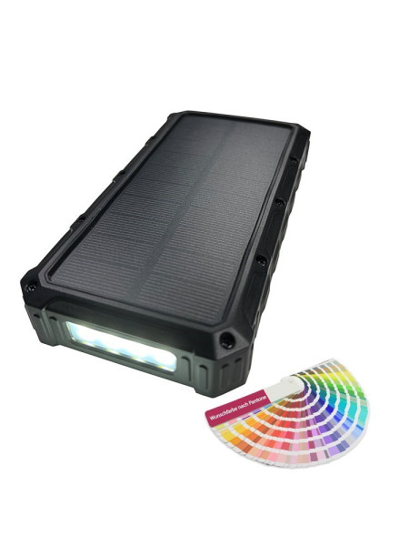 Material: ABS Größe (L x B x H): 164 x 84 x 28 mm Gewicht: 539 g Standardfarbe/n: schwarz, rot, orange, grün, blau Sondereinfärbung Kunststoff in Wunschfarbe auf Anfrage Veredelungsart: - Druck Veredelungsbereich Vorderseite: 40 x 2mm / Rückseite: 13 x 13mm Besondere Produkteigenschaften: Solar Panel, QI Wireless Charging Funktion (Aufladen ohne Kabel), Taschenlampe, IP54 Rainproof, Schlagschutz: Der Akku im Gehäuseinneren ist mit Schaumstoff gut vor einem Sturz geschützt, Akkustandanzeige in 25% Schritten (4 LED), inklusive Karabiner mit Schlaufe zur optionalen Befestigung z.B. am Rucksack