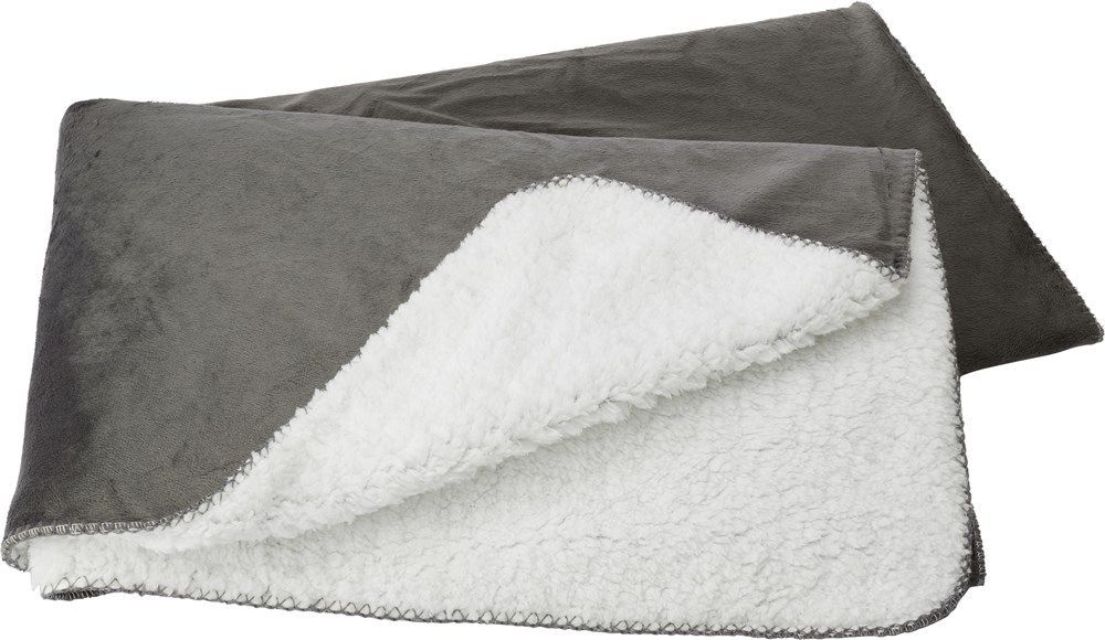 Kuscheldecke aus Polyester, mit Verschlussband und Label für die Werbeanbringung.